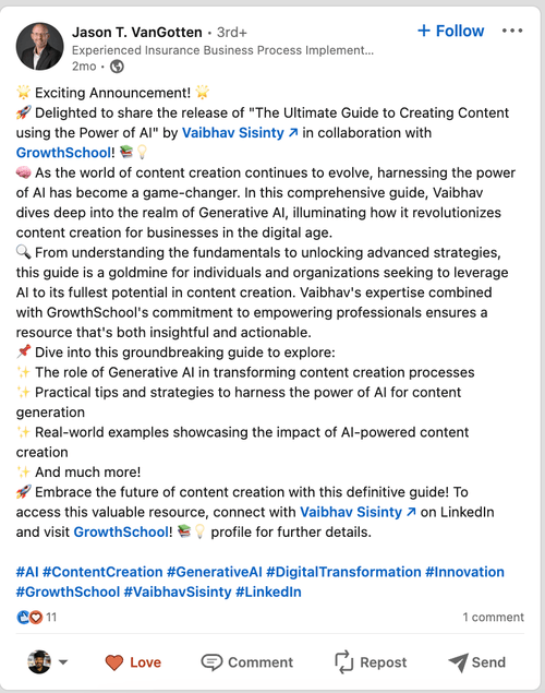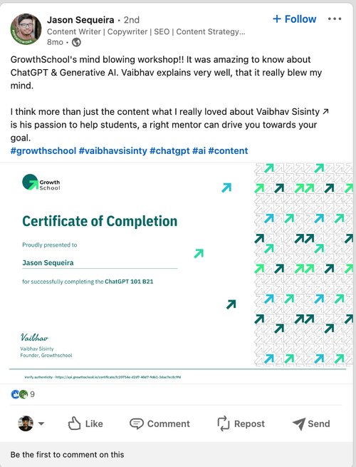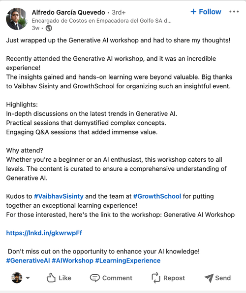 I've helped 100,000+ learners through my LinkedIn and Growth Hacking program. And, I've also helped more than 1 million people leverage the power of Generative AI and ChatGPT.